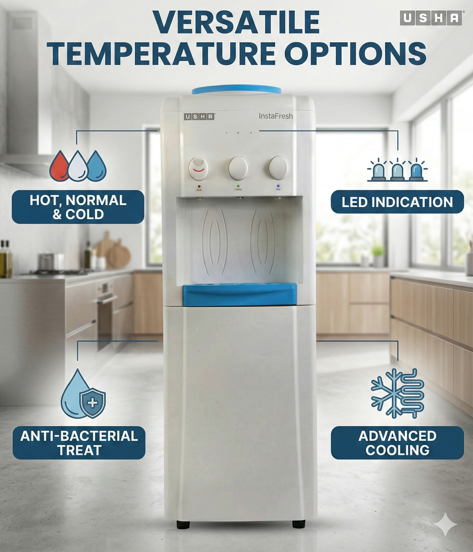 Usha water dispensers are appliances designed to provide instant access to hot, cold, and room-temperature drinking water (model-dependent). They come in various styles — from compact tabletop units to larger floor-standing models with additional features like cooling cabinets or digital controls.